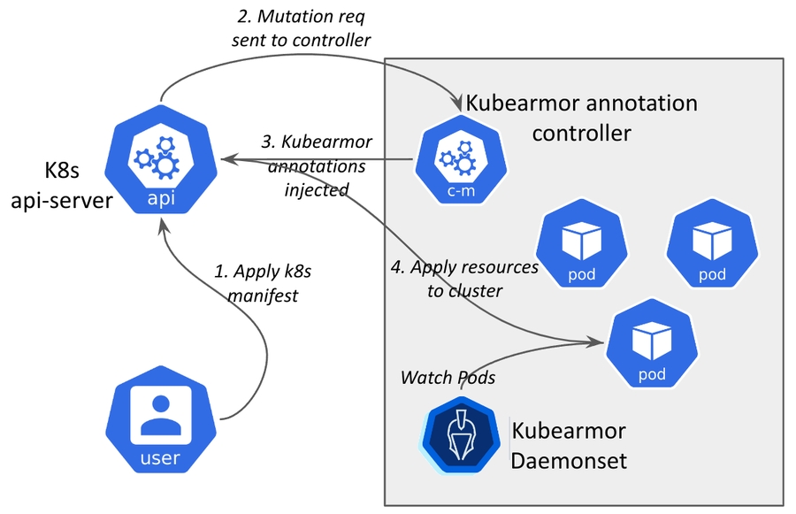 KubeArmor depends upon AppArmor, SELinux and the underlying LSMs for security policy enforcement. In the context of k8s, such policies need to be specified as annotations. Before v0.5, Kubearmor used to apply deployment patch to inject such annotations. This resulted in the deployment to be restarted. Furthermore, one cannot apply annotations to pods that are not started as part of deployments.