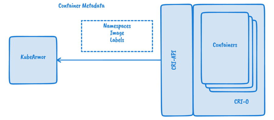 KubeArmor directly interfaces with container runtimes to get metadata like container’s namespaces, image and so on. This metadata is then used for generating rich telemetry data and policy enforcement.