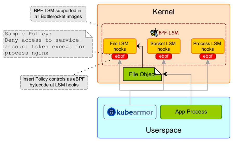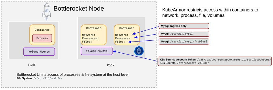 KubeArmor provides enhanced security by using BPF-LSM to protect Bottlerocket containers from within by limiting system behavior with respect to processes, files, etc. For e.g., a k8s security access token that is mounted within the pod is accessible by default across all the containers. KubeArmor can restrict access to such tokens only for certain processes. Similarly KubeArmor can be used to protect other sensitive information e.g., k8s secrets, x509 certs, within the container. Moreover, KubeArmor can restrict execution of certain binaries within the containers.